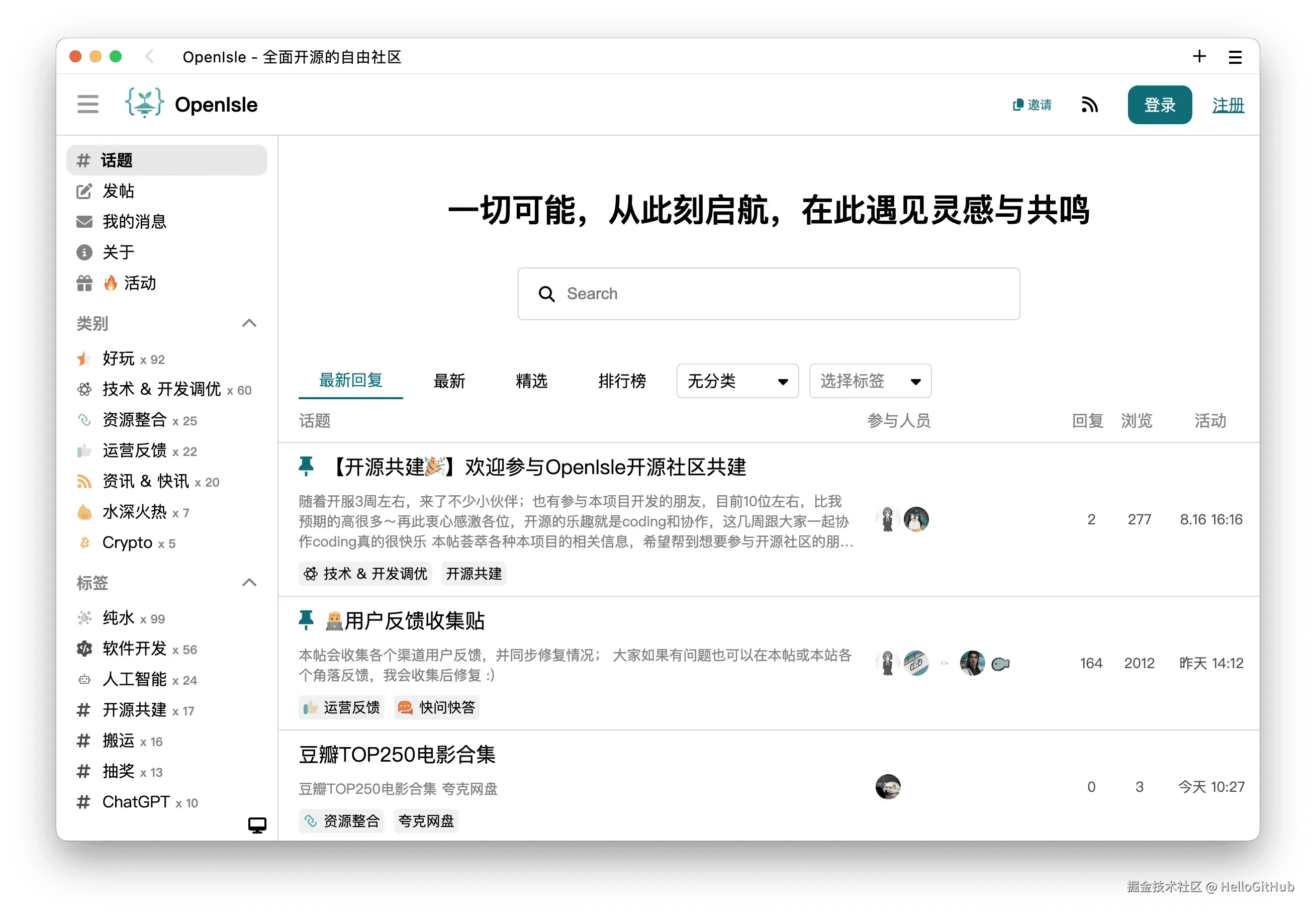 10、OpenIsle:Java 开发的轻量级开源社区系统。这是一个基于 Spring Boot 和 Vue3 构建的开源自由社区系统,定位为轻量级的 Discourse。它完全开源、可二次开发,支持白名单邀请、自定义标签、实时通知等功能。