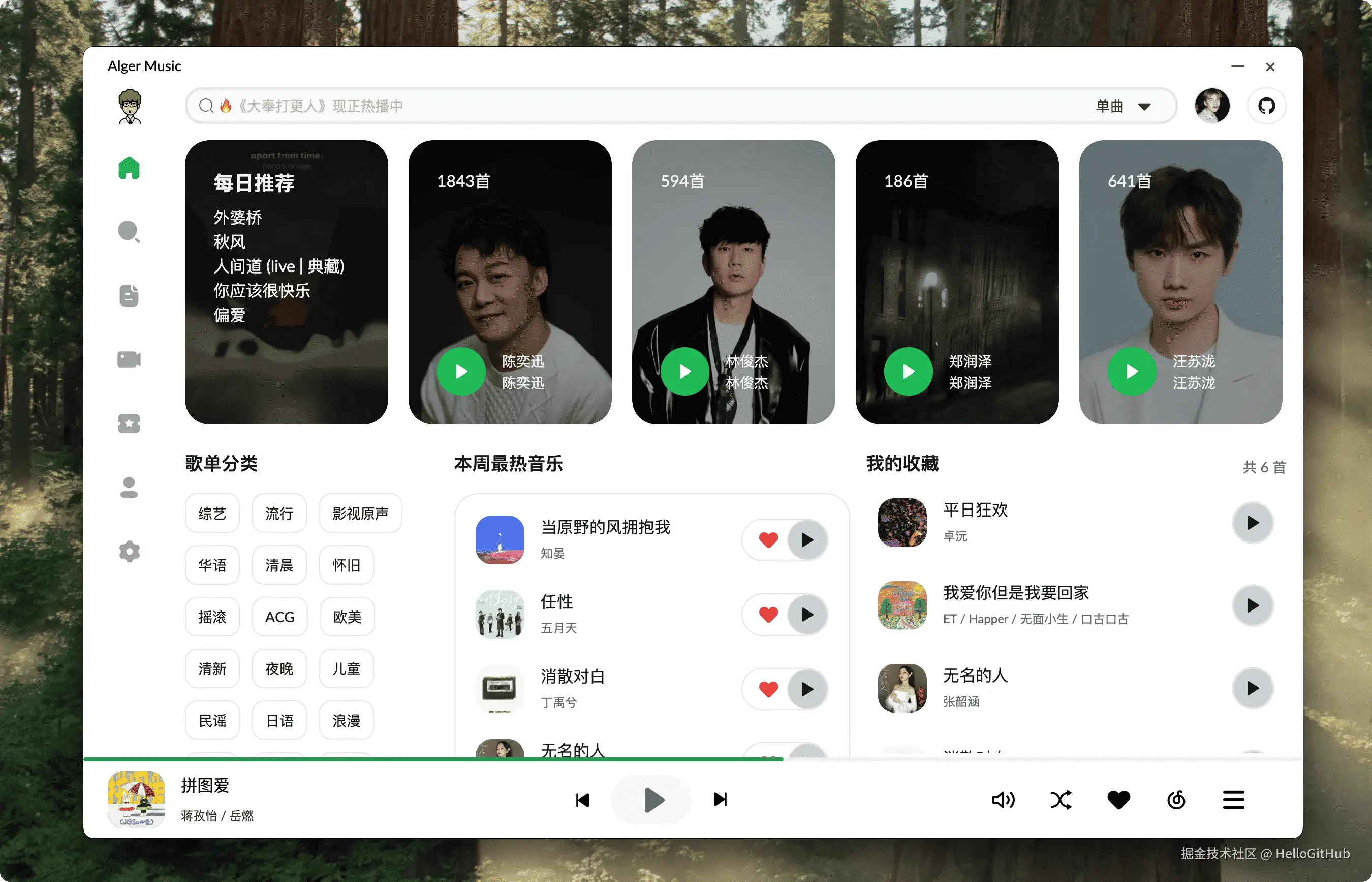 15、AlgerMusicPlayer:简约美观的音乐播放器。这是一款基于 Electron 开发的第三方音乐播放器,拥有高颜值的界面和丰富的功能,支持本地化服务、桌面歌词显示、音乐下载等,适用于多平台使用。