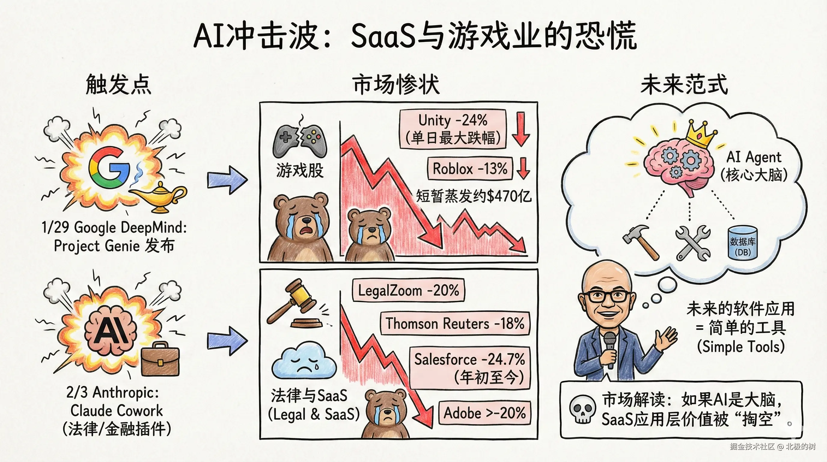 1月29号,Google DeepMind发布了Project Genie。当天Unity暴跌24%,创下了2022年以来最大单日跌幅。Roblox跌了13%。游戏股短暂蒸发了约470亿美元。