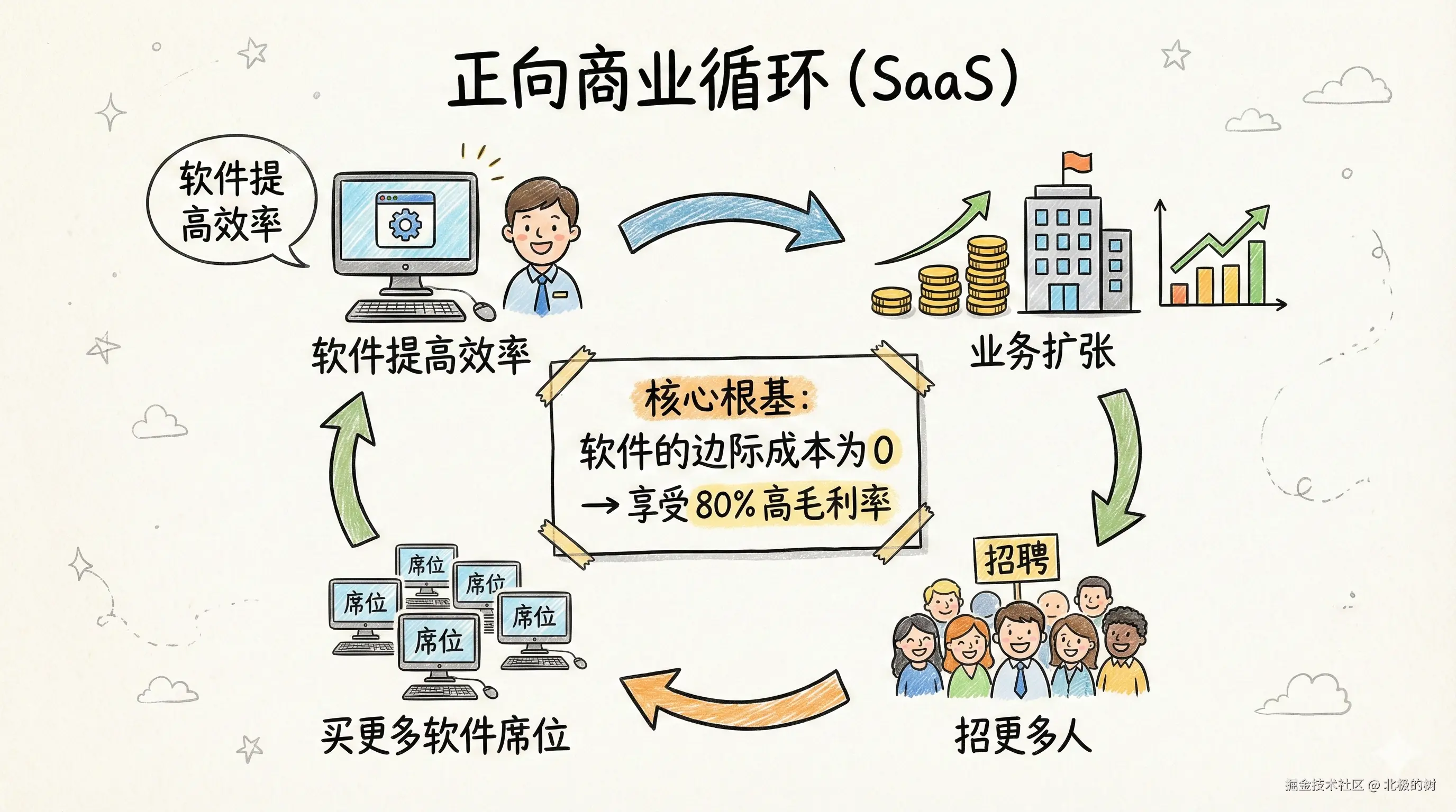 正向循环是这样的:软件帮员工提高效率,效率提升带来业务扩张,扩张需要招更多人,更多人需要买更多软件席位。这是很多SaaS公司能享受到80%毛利率的根基(因为软件的边际成本为0)。