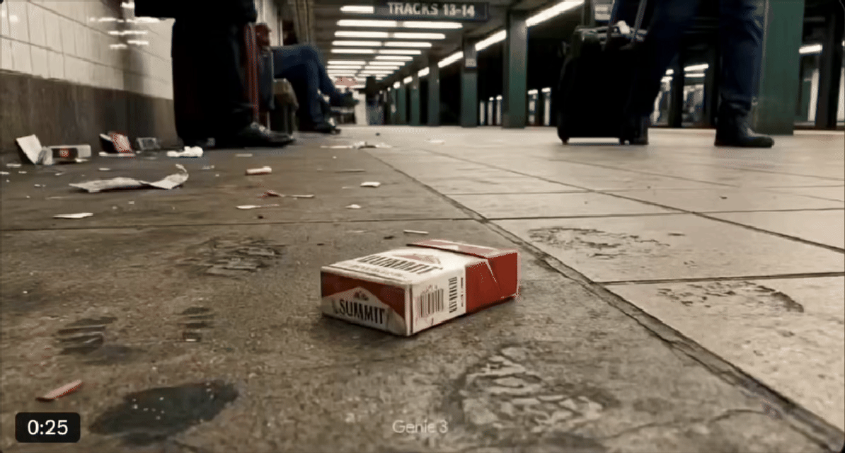 过去是生成式AI,比如Sora,生成的是视频,用户只能看不能动。而Genie生成的是可交互的环境。据了解它的世界模型学习了数百万个小时的游戏视频,理解了游戏物理引擎的绝大部分细节(重力、碰撞等)和交互逻辑。用户输入一段文字描述,比如"一个烟盒的冒险之旅",Genie直接生成一个可交互的3D环境。用户通过键盘控制角色在里面行走、跳跃,24帧实时生成。