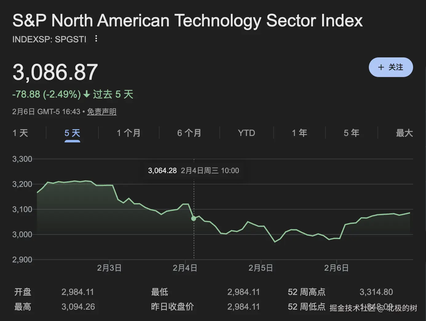 有一个专门追踪美股SaaS公司的标普北美软件指数(SPGSTI),2月第一周单日暴跌超6%,仅2月3号一天就蒸发了接近3000亿美元的市值。而整个2月的前7个交易日,累计蒸发接近万亿。