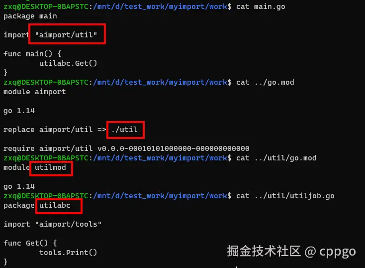 1 zxq@DESKTOP-0BAPSTC:/mnt/d/test_work/myimport/work$ cat main.go