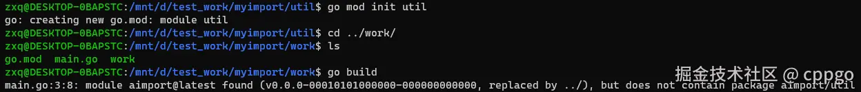 1 zxq@DESKTOP-0BAPSTC:/mnt/d/test_work/myimport/work$ go build