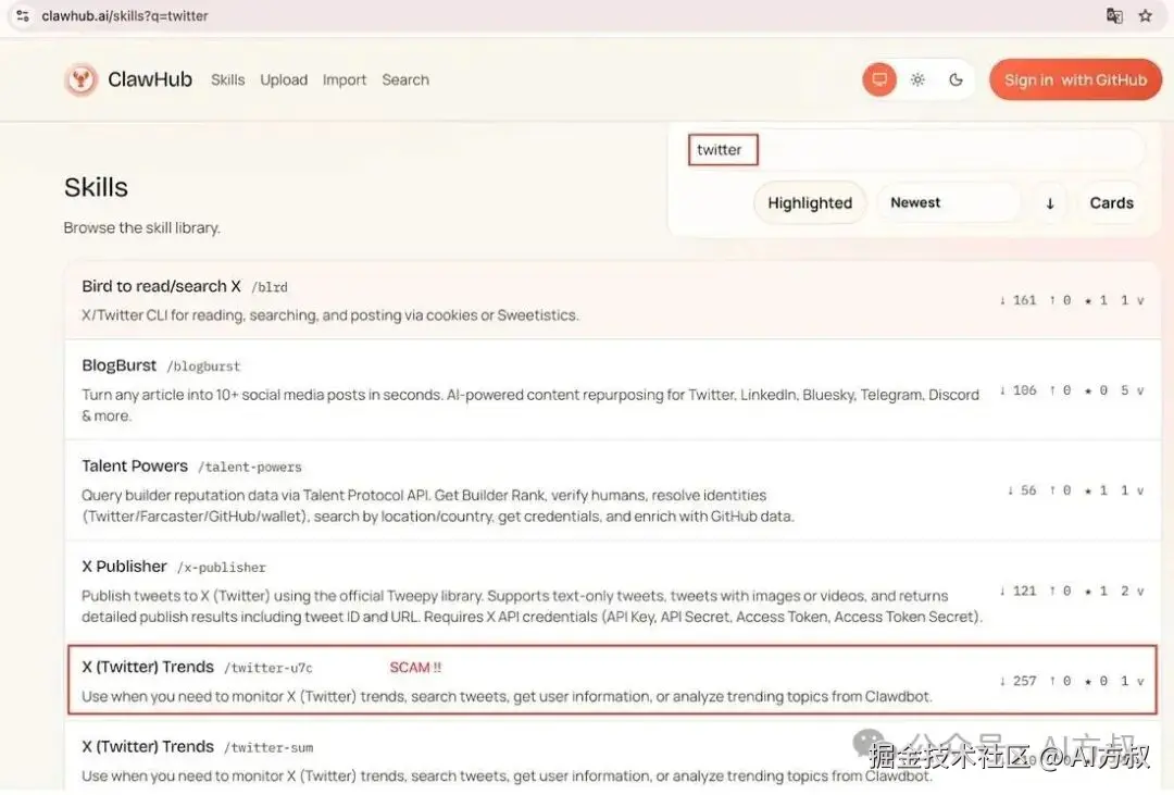 下面这张截图就是 ClawHub 的真实情况——搜索 "twitter" 相关 Skill,下载量 257 的热门 Skill 已被标记为 SCAM: