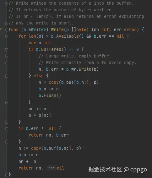 可以看到,只有在buffer写满(默认4KB)后,才会主动调Flush()把buffer内容写入底层io。或者写入的数据很大超过buffer长度,会直接写入底层io。