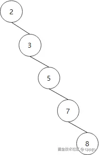 查找时,类似二分法,最优是O(logN)。最差是O(N),如下一条腿特别长,需要挨个遍历: