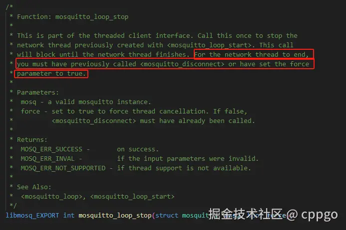 经过调查,发现其现象原因是,在发生断连后,回调on_disconnect中只只调用了mosquitto_loop_stop,而且非强制,所以loop线程并没有真正结束,mosquitto_loop_stop也会阻塞在join中。