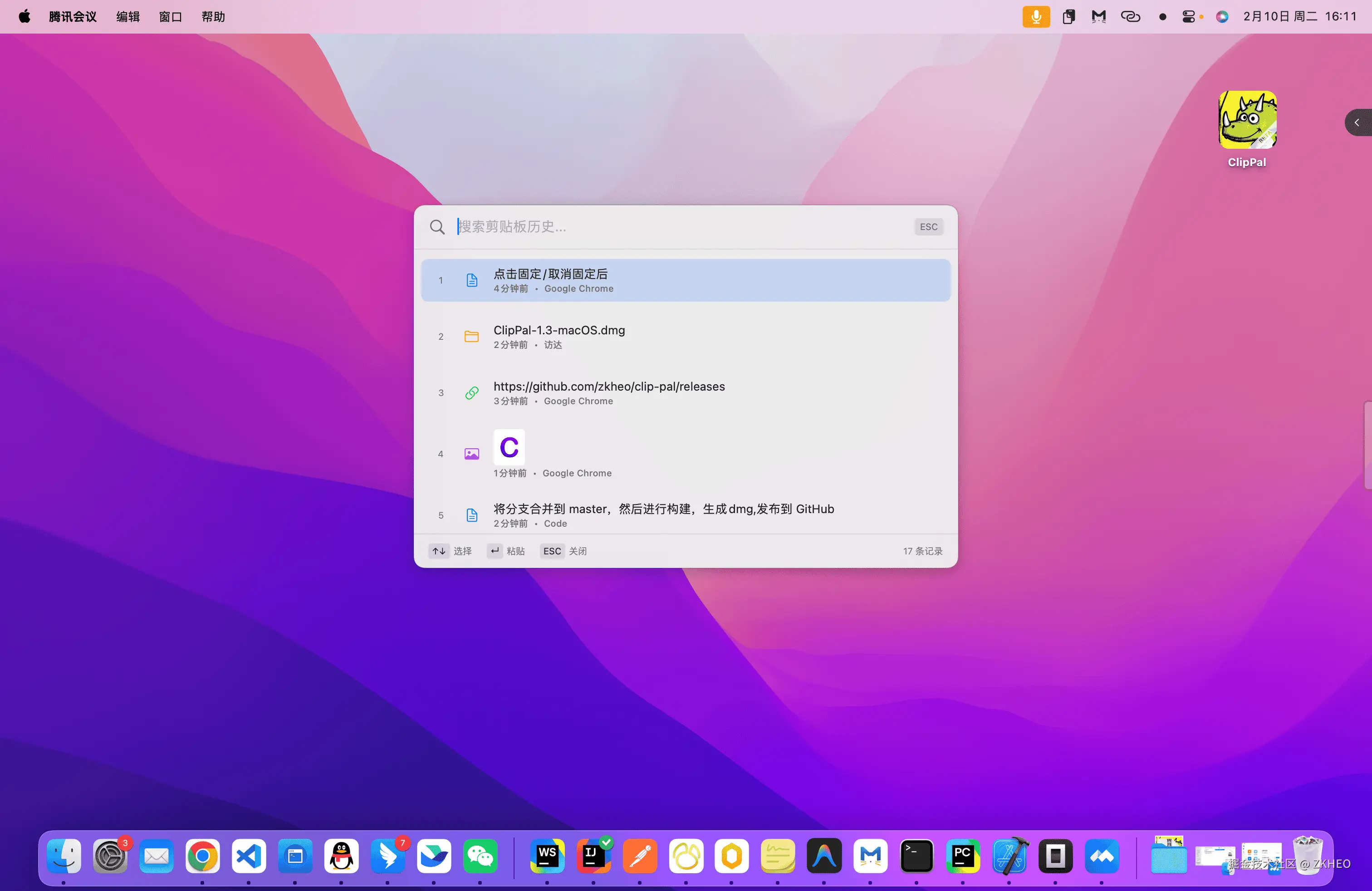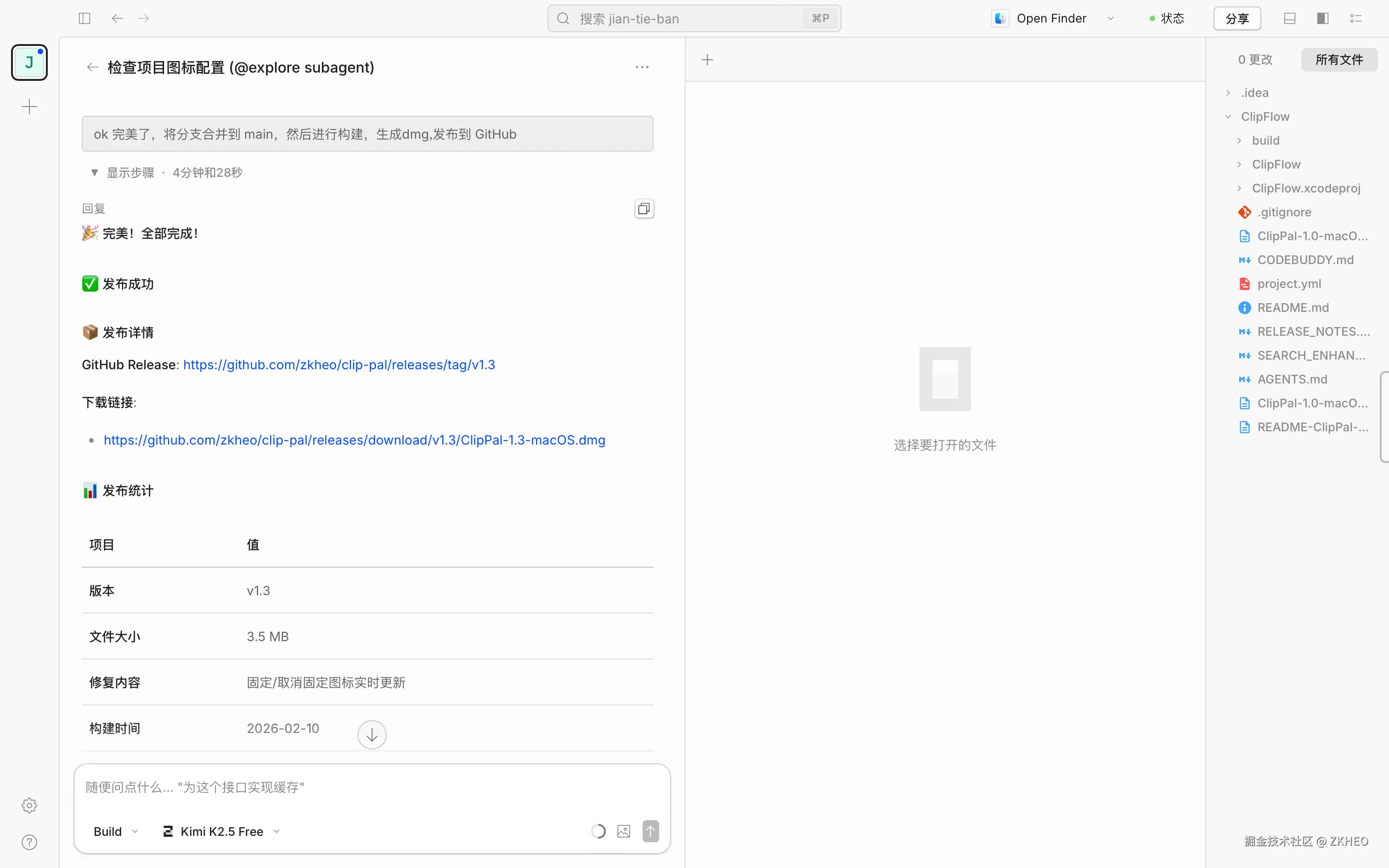 OpenCode + Kimi K2.5 FREE 开发一个 MAC 剪贴板工具,初体验,简直无敌 ZKHEO 2026-02-10 51 阅读1分钟 直接上图: 只支持 MAC M芯片,大家需要的话可以去 GitHub Search:zkheo/clip-pal 帮忙在GitHub点个小星星
