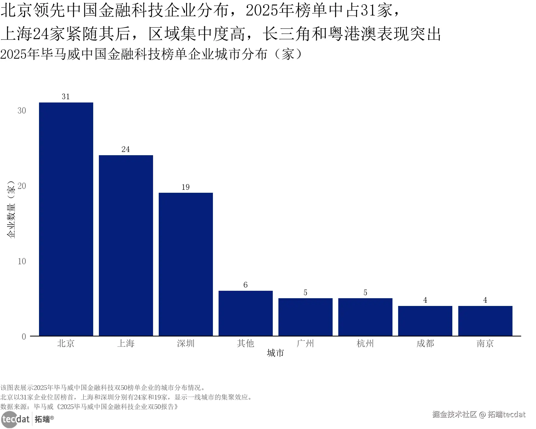 毕马威金融科技榜单企业城市分布条形图表10数据及PDF模板已分享到会员群