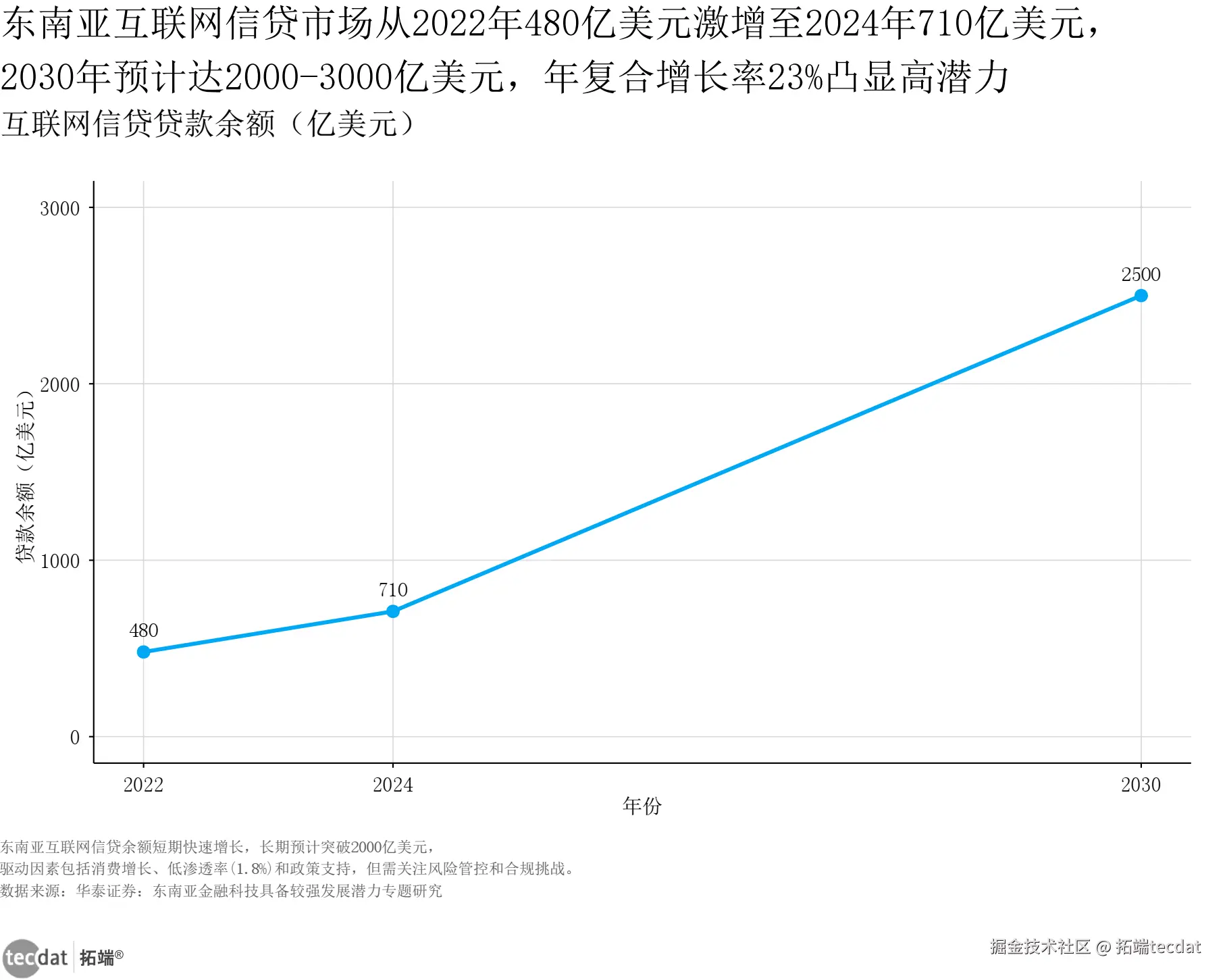 3秒解读:东南亚互联网信贷余额从2022年480亿美元增至2024年710亿美元,2030年预计达2500亿美元,年复合增长率23%,市场潜力巨大。
