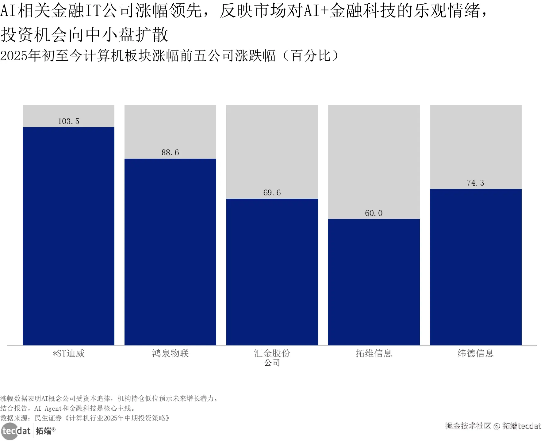 3秒解读:2025年初至今,*ST迪威(103.51%)、鸿泉物联(88.63%)等AI金融相关企业涨幅领先,市场对AI+金融科技概念高度认可。