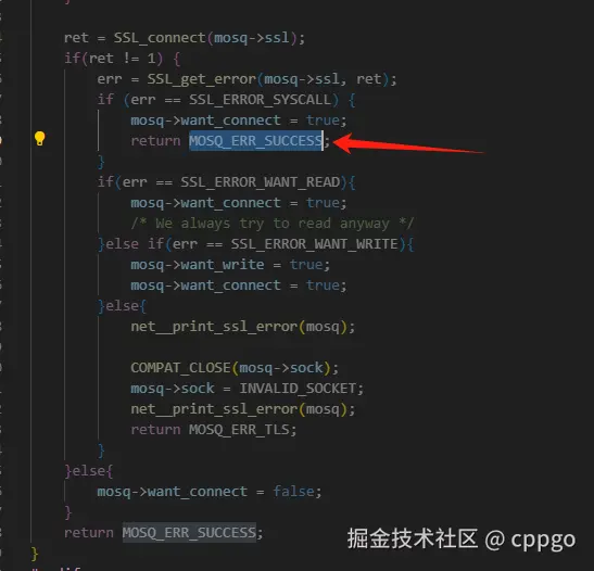 在net__socket_connect_tls中,SSL_connect失败返回的err信息是SSL_ERROR_SYSCALL,系统会返回MOSQ_ERR_SUCCESS。进入下一次循环:*