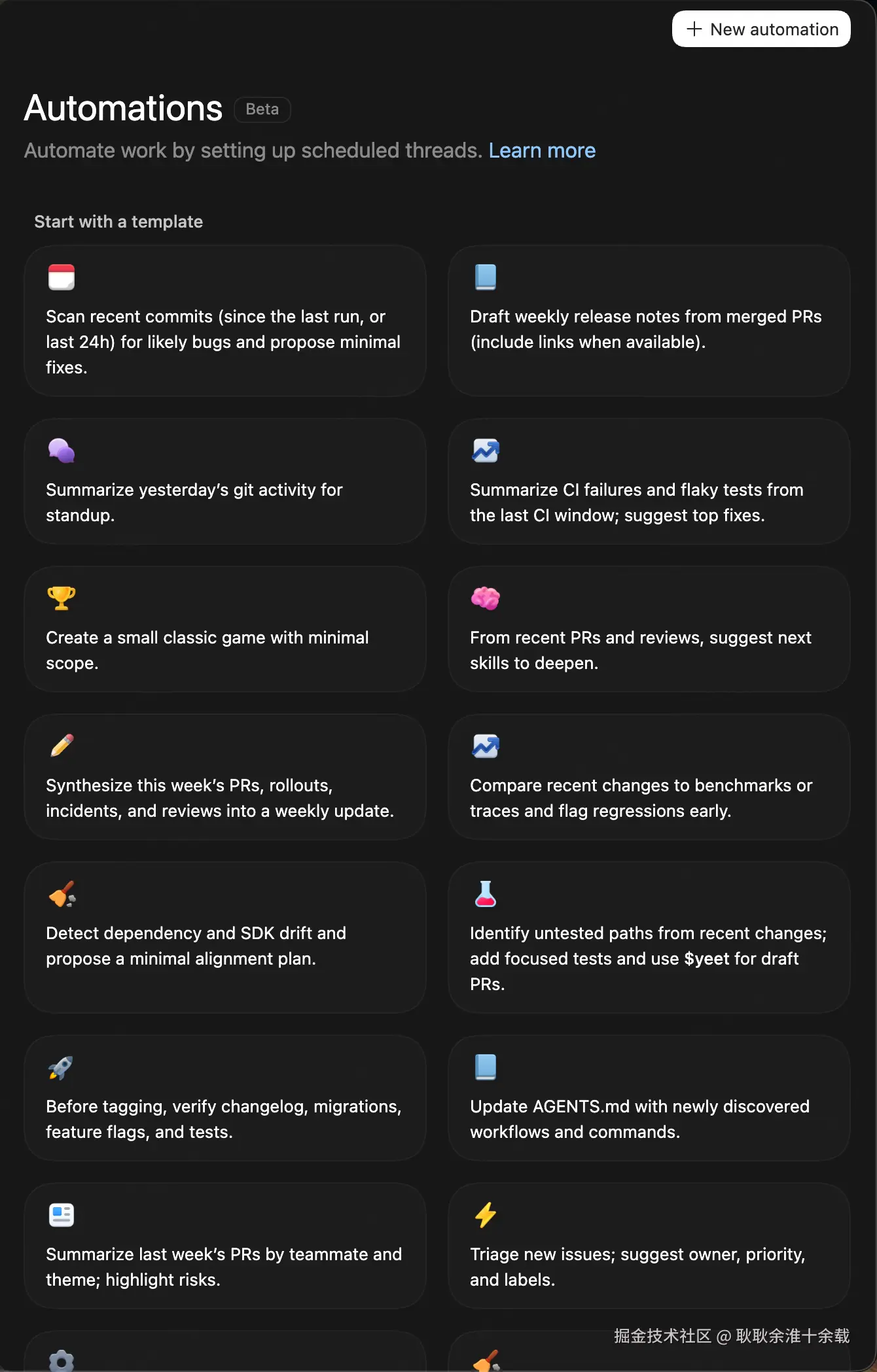 点击进来之后有很多模板,你可以直接使用模板创建自动化(说白了就是帮你写好prompt,你也可以在使用的时候自己修改),也可以直接创建一个全新的