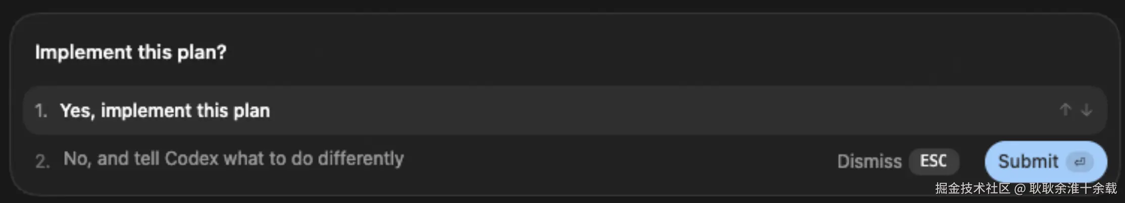当他计划完成后就会出现如下弹窗,如果有修改的再告诉他就好了,但实话实说,codex 的 plan的交互并没有cursor或者Antigravity的markdown 的plan来的舒服,毕竟markdown可以精细化修改,再和codex说修改哪里的计划未免会担心他把其他地方改毁了