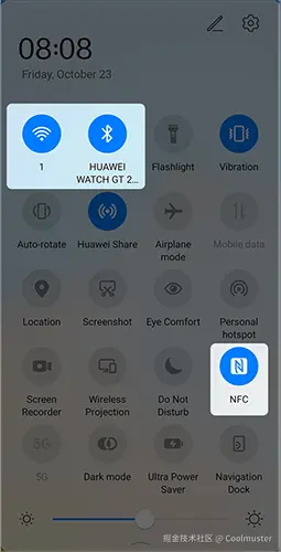 步骤 2. 在华为手机上向下滑动以显示通知面板,并激活 NFC、Wi-Fi 和蓝牙。