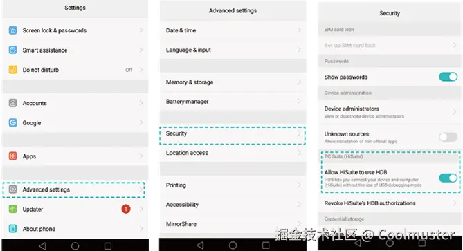步骤 2:在华为手机上开启 USB 调试模式。然后依次进入“设置”>“高级设置”>“安全”,点击“允许 Hisuite 使用 USB 调试”。之后,备份和恢复选项将显示在窗口中。