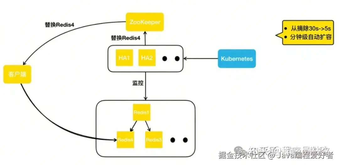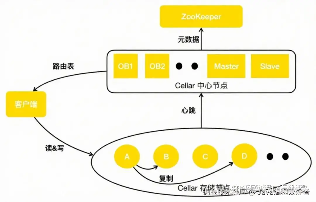 相较于阿里开源的 Tair,美团在架构层面做了两个关键改进:一是引入了 OB(Observer)节点,二是引入了 ZooKeeper 来增强集群的元数据管理能力。