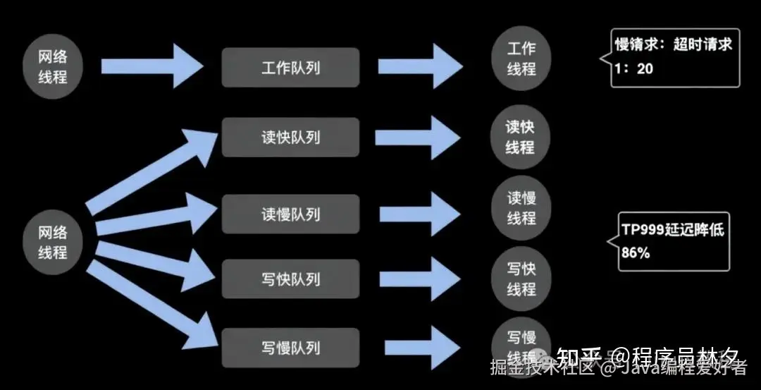 这种设计实现了不同请求类型的资源隔离。例如,一个慢读请求不会阻塞快写请求的处理。
