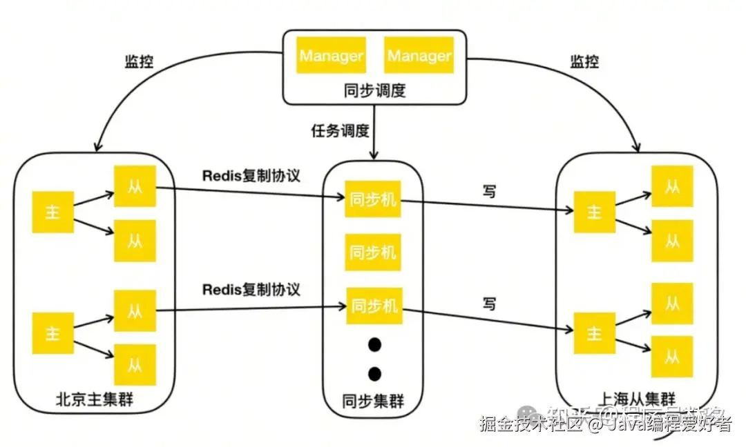当客户端向北京主集群的 A 节点发起写操作时,A 会像普通集群那样,将数据复制到 B 和 D 节点。同时,A 还会将该写操作发送到上海从集群的 H 节点。H 节点接收后,在本地执行写操作,并将其复制到从集群的 I、K 节点。