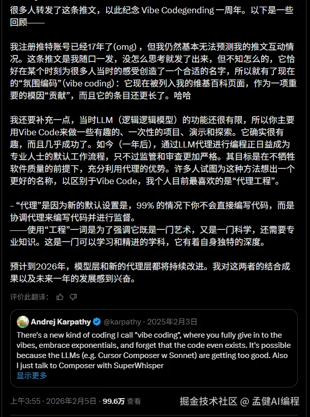 2 月 4 日,Andrej Karpathy(OpenAI 联合创始人,前 Tesla AI 负责人)在 X 上发了一条长帖,纪念 Vibe Coding 诞生一周年。但他不是来庆祝的,他是来"改名"的——