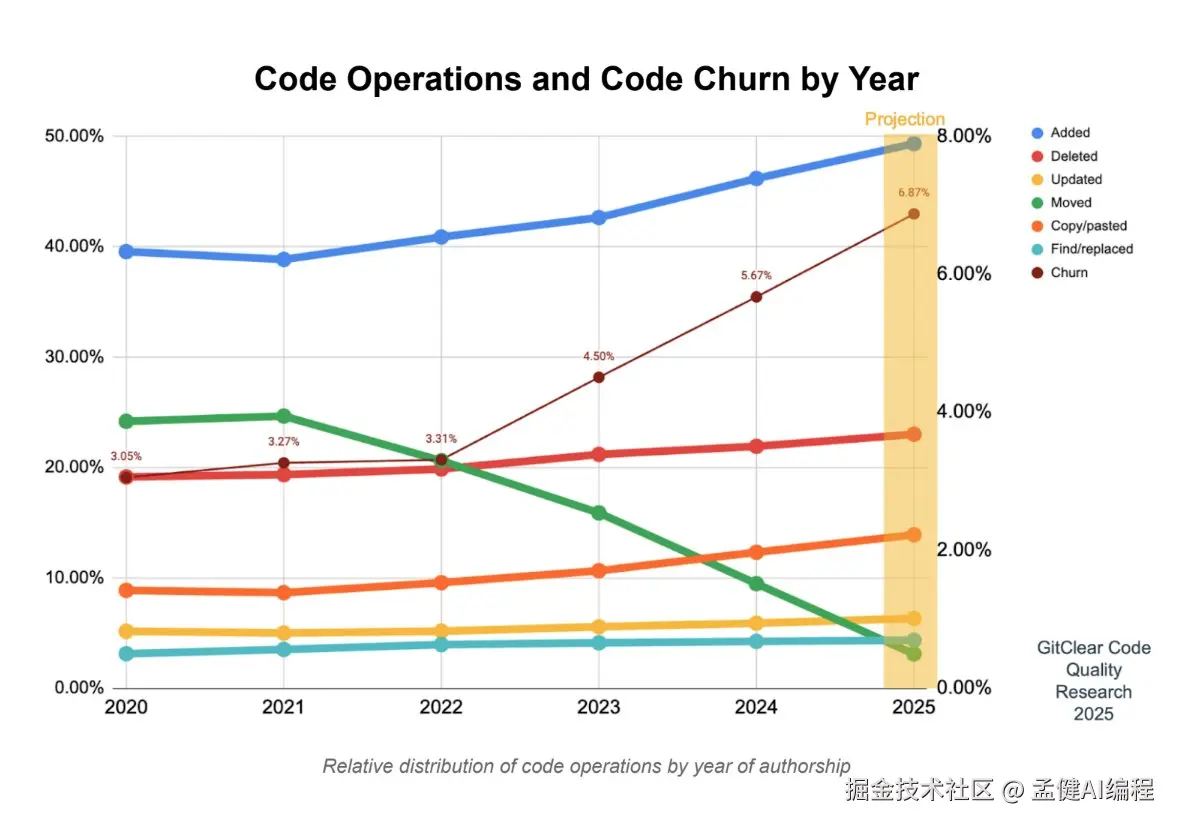 GitClear 的数据也印证了这点:AI 生成代码的 code churn(写了又改、改了又删的比例)比人工代码高了近一倍。代码写得多≠代码写得好。