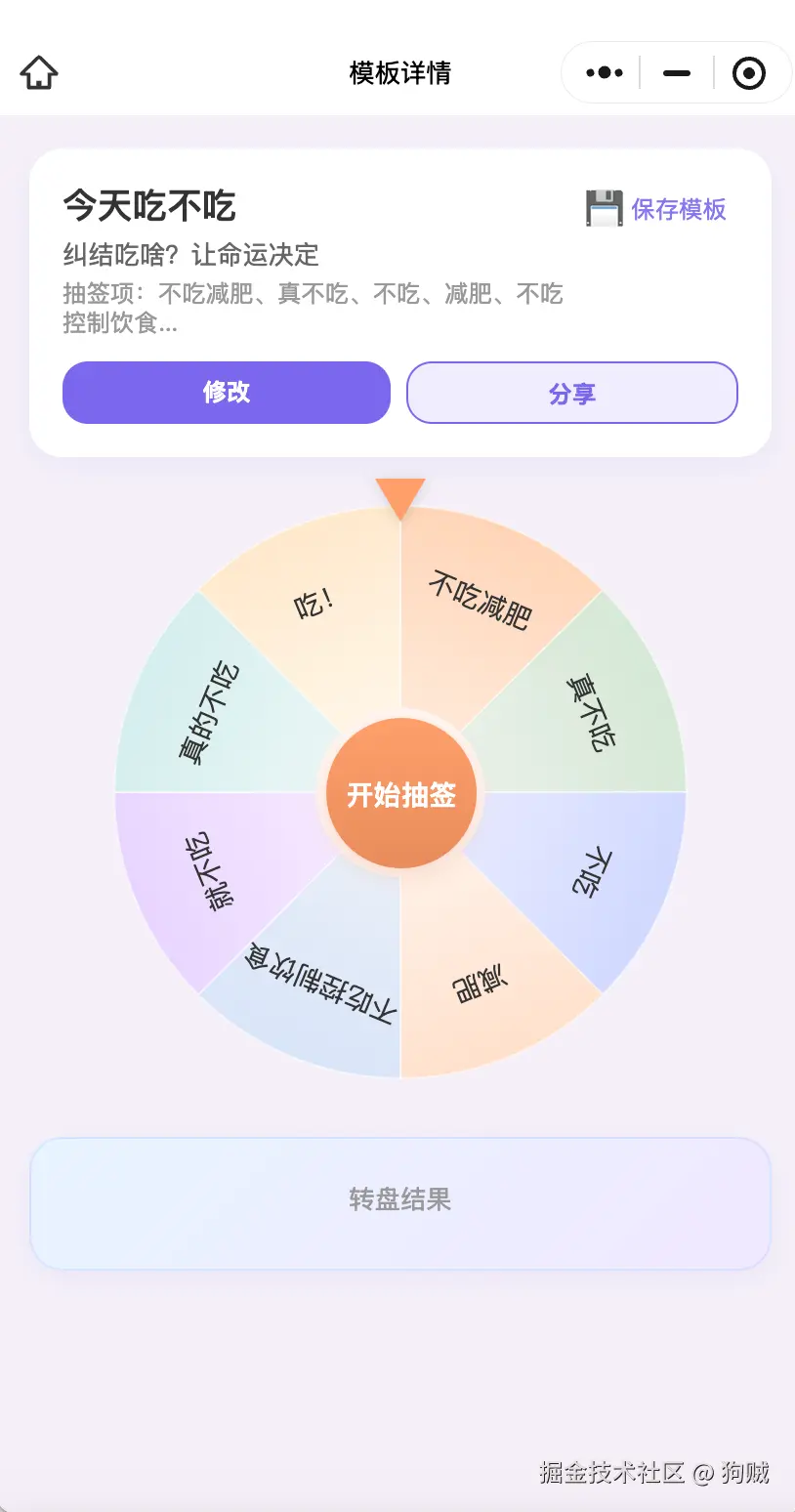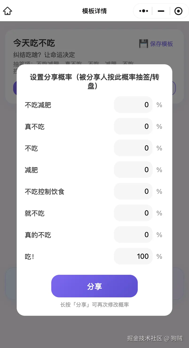 表面看,这就是个平平无奇的随机转盘。但!只要我在分享前长按那个“分享”按钮,就能偷偷设置概率。嘿嘿