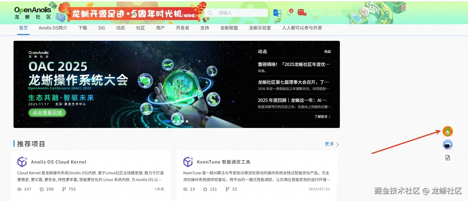 活动期间,首次登录龙蜥官网,会自动弹出“龙蜥开源足迹”,一键点击开启。若手滑退出或再次进入龙蜥官网,不用担心,可在官网顶部点击“龙蜥开源足迹”图片或官网右侧图标,都可开启活动。