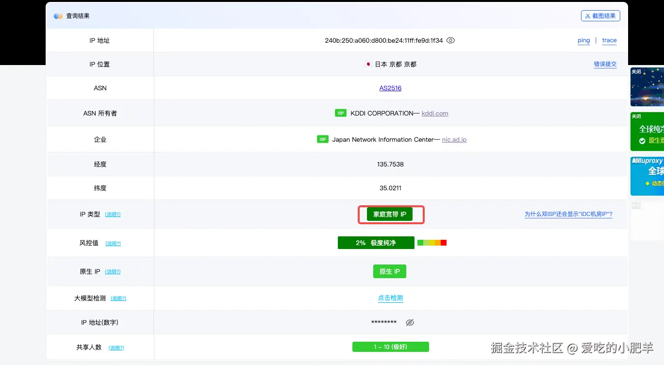显示"家庭IP"就安全。显示"IDC机房就得换。