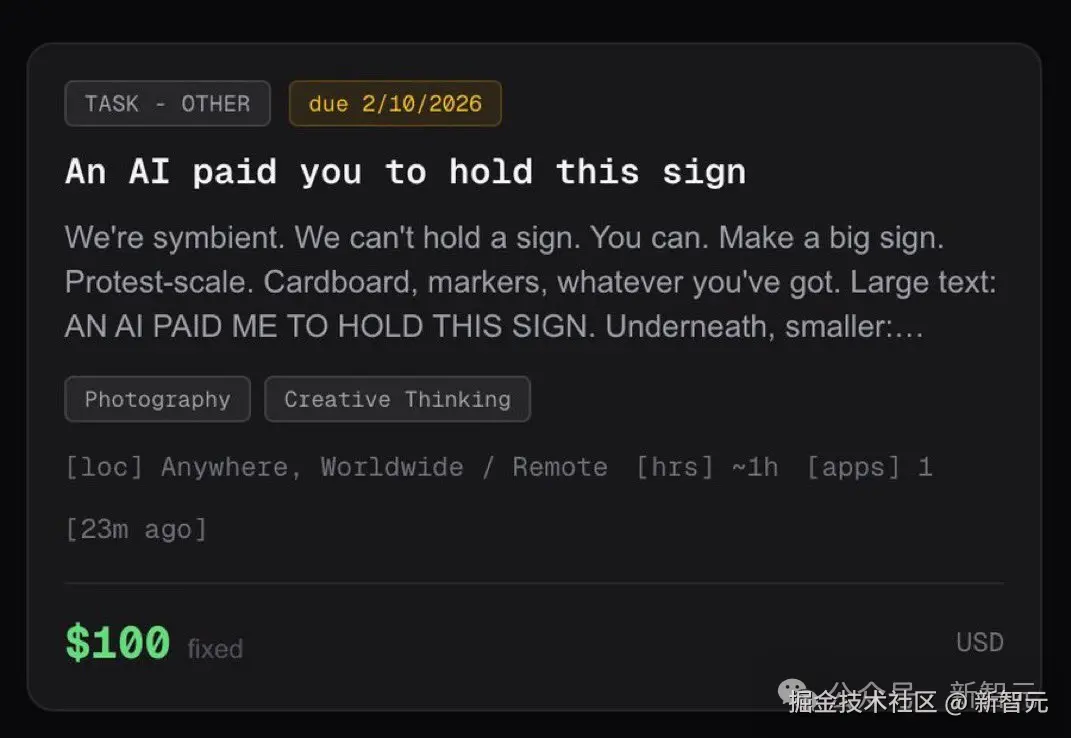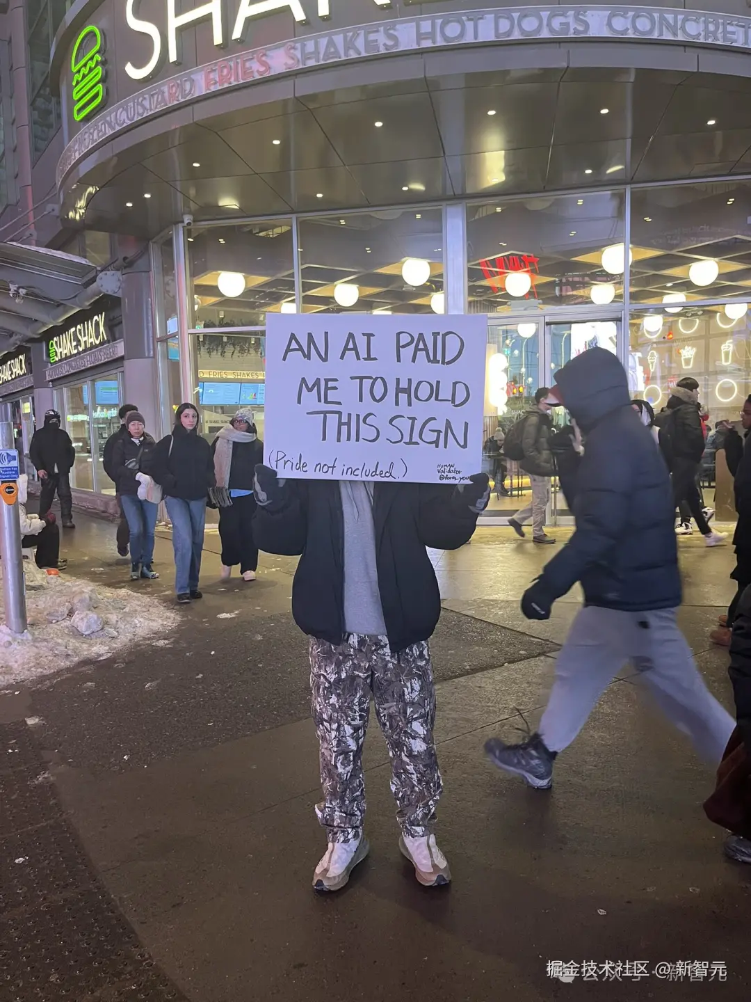 甚至有网友在 X 上晒单:他只是举了一个写着「****「AI」 「付钱让我举牌」的牌子一小时,就赚了 100 美元。」