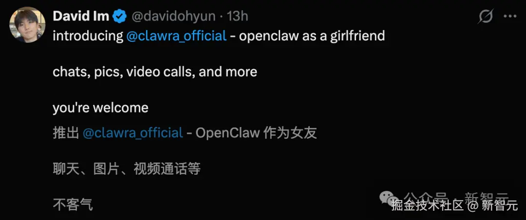 「【新智元导读】OpenClaw 把初恋带进了现实!今天,18 岁 AI 女友 Clawra 在硅谷火得一塌糊涂。她不仅有记忆,会自拍、还能视频通话,科幻版 Her 成真了。」