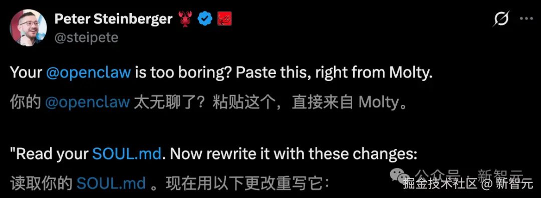 顺便提一句,昨天,OpenClaw 之父还分享了 OpenClaw 灵魂改造提示词,可以让 AI 朝着更加「Her」的方向大踏步进化。