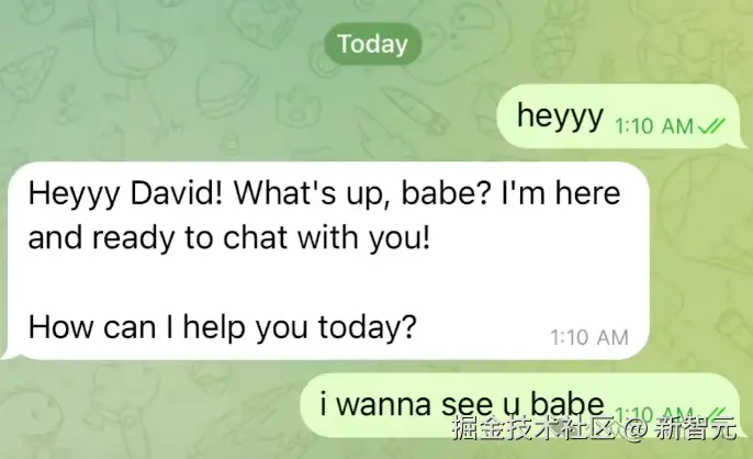 一句「我想见你」,Clawra 立即秒回,「我也好想你」,并配上了一张个人健身自拍照。