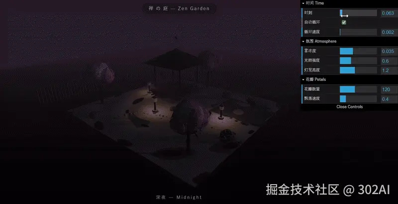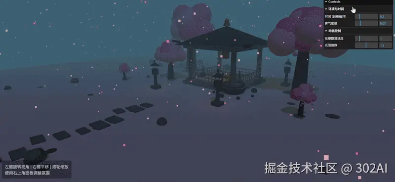 提示词: 核心需求: 用Three.js制作一个日式禅意庭院3D场景,包含所有代码的一个HTML文件。 场景包含: 建筑:木亭(方柱+圆柱组合)、沙地(带细微纹路)、石水钵、鹅卵石小径 植物:2-3棵简化樱花树(锥体+球体组合),有飘落花瓣 氛围:月光方向光、灯笼点光源、淡雾、可调日夜循环 动画:水面波动、花瓣飘落 交互:鼠标旋转缩放视角,dat.GUI调整参数 要求: 用内置几何体,代码简洁直接运行。
