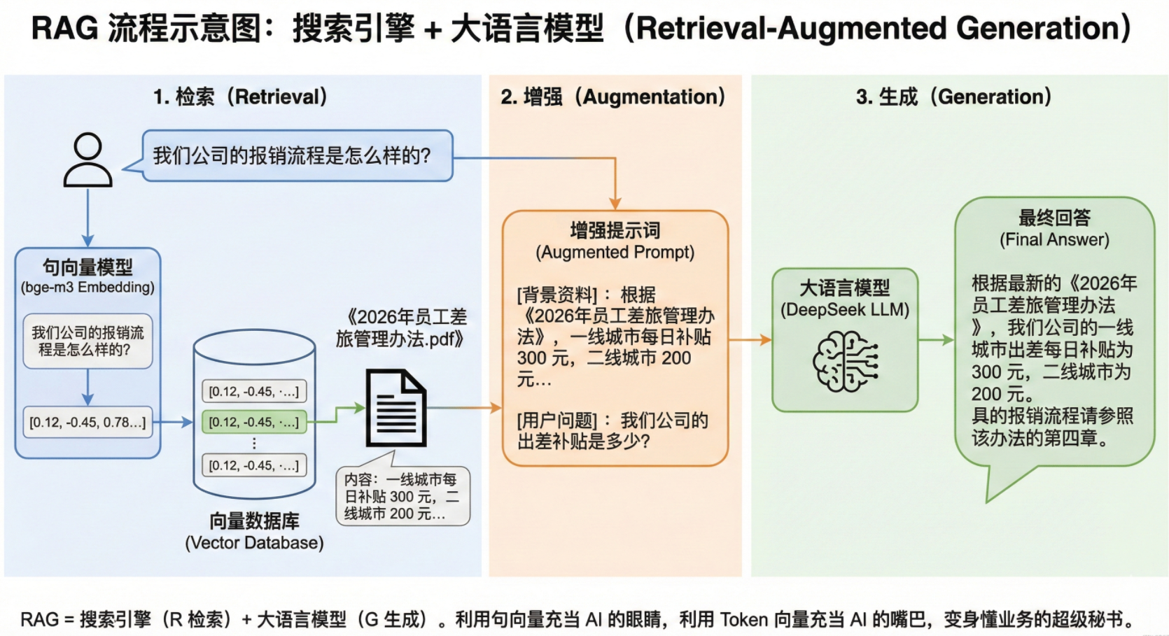 R (检索):利用 句向量,充当 AI 的眼睛,帮它看到外部的最新、最私密的知识。