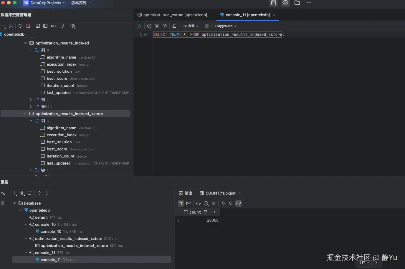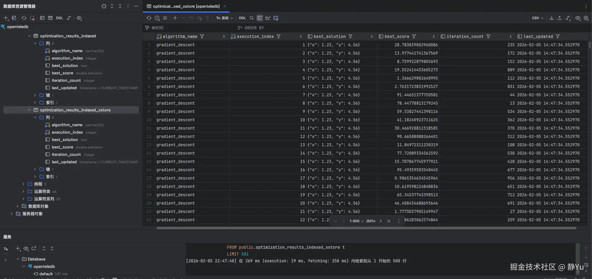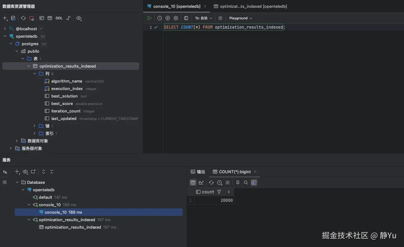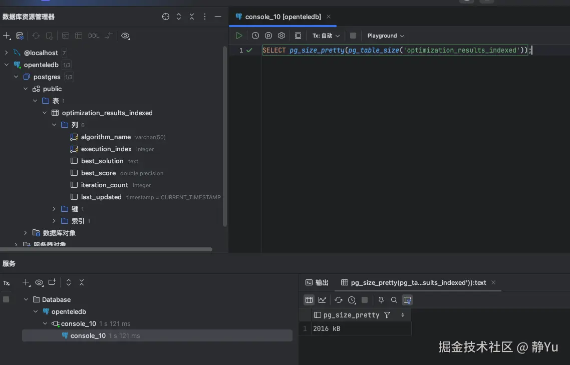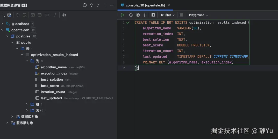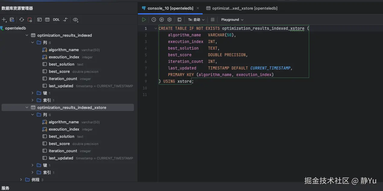 我首先要做的是实现一个SQL语句,确保数据库中存在一个用于存储优化结果的表。具体来说,下面这段SQL会检查并创建一个名为 optimization_results_indexed 或 optimization_results_indexed_xstore 的表,表结构设计用于存储优化算法的执行结果。表包括以下字段: