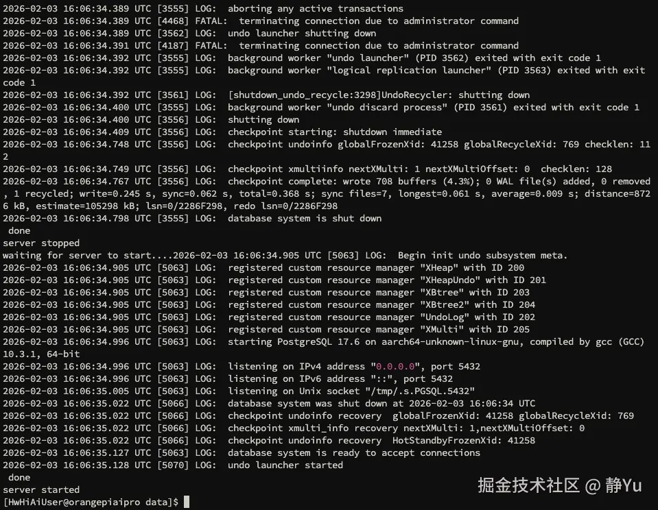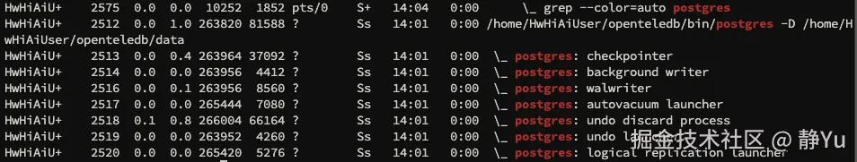 启动之后也可以ps uxf | grep postgres 命令用于查看 OpenTeleDB 数据库相关的所有进程