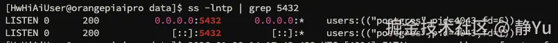 修改完成之后,可以通过ss -lntp | grep 5432验证是否生效,如果是0.0.0.0就代表允许外部ip访问。
