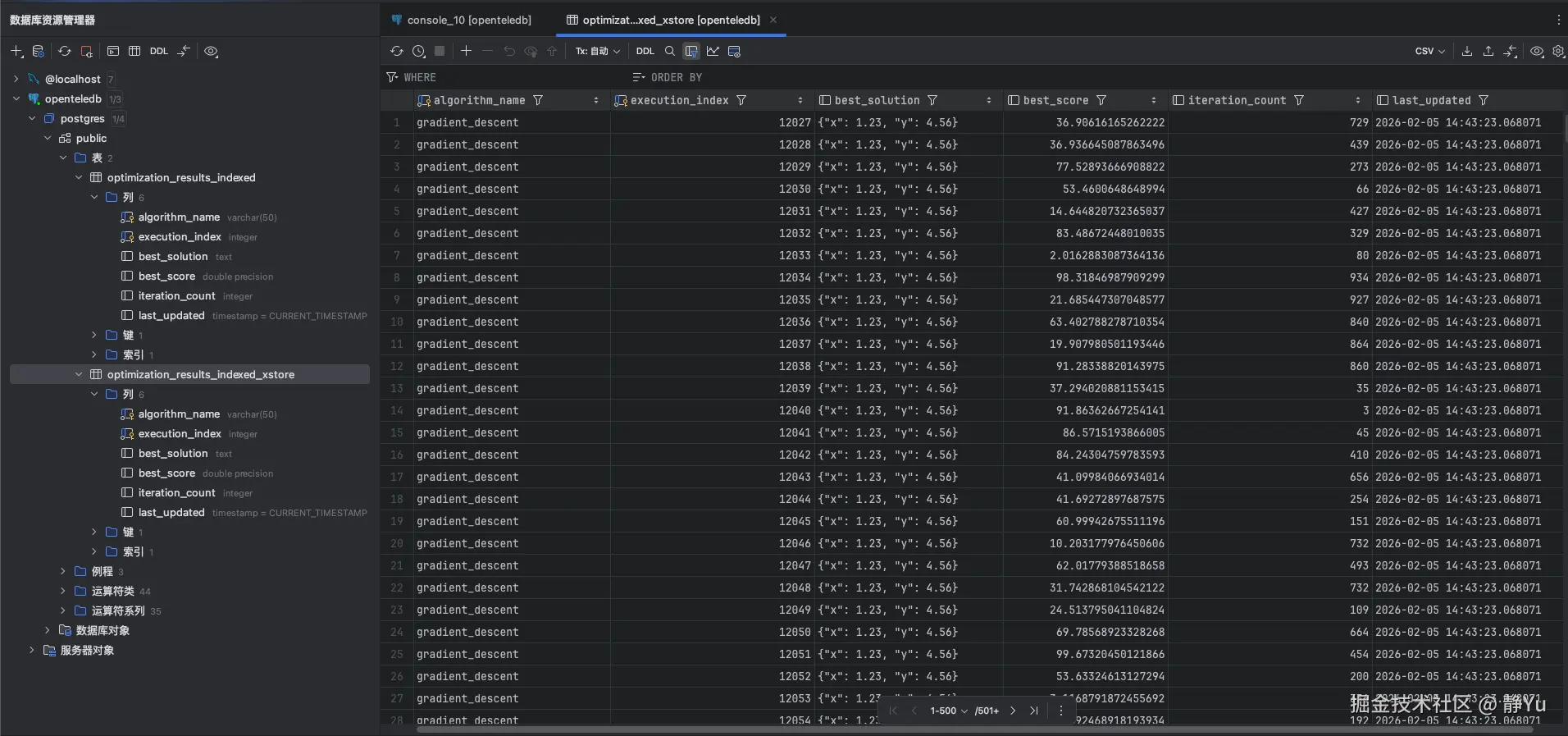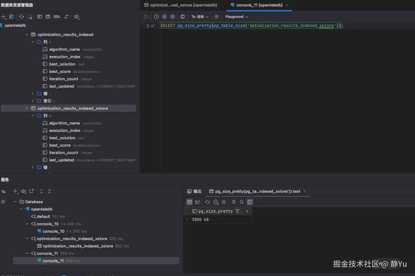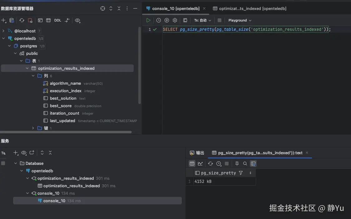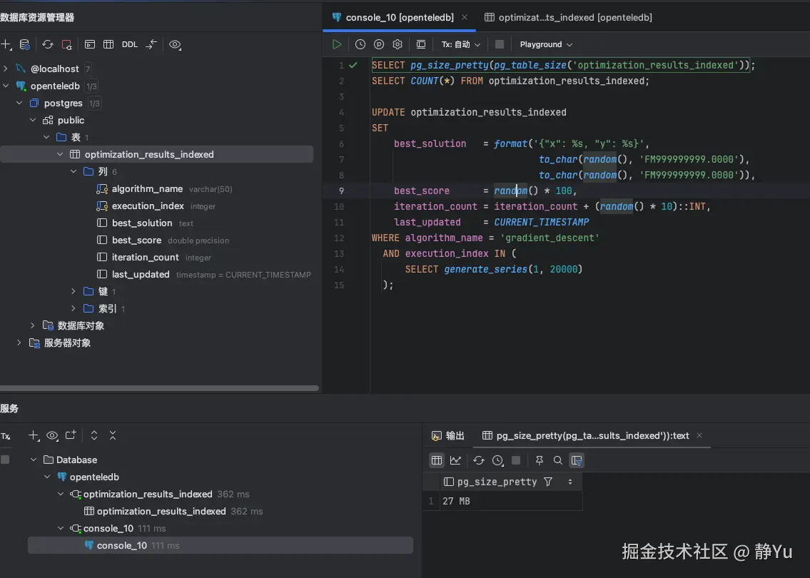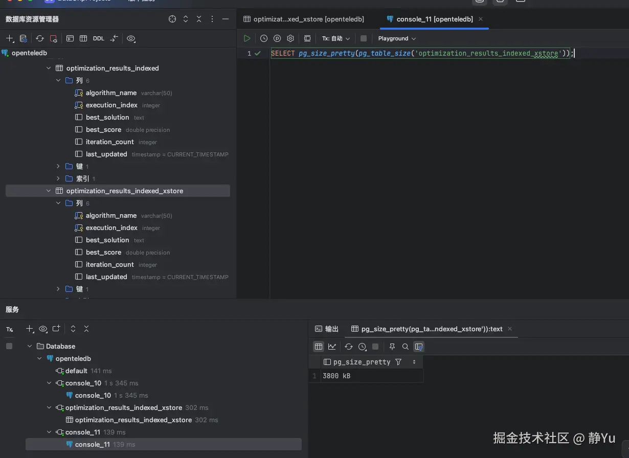 现在来模拟一下我的业务场景,通过SQL模拟一个优化算法来生成大量的中间结果数据.为了验证Xstore在表空间膨胀的表现,测试过程中我创建了两张表,一张是正常创建的数据库表(optimization_results_indexed),另外一张是使用Xstore引擎创建的数据库表(optimization_results_indexed_xstore)。