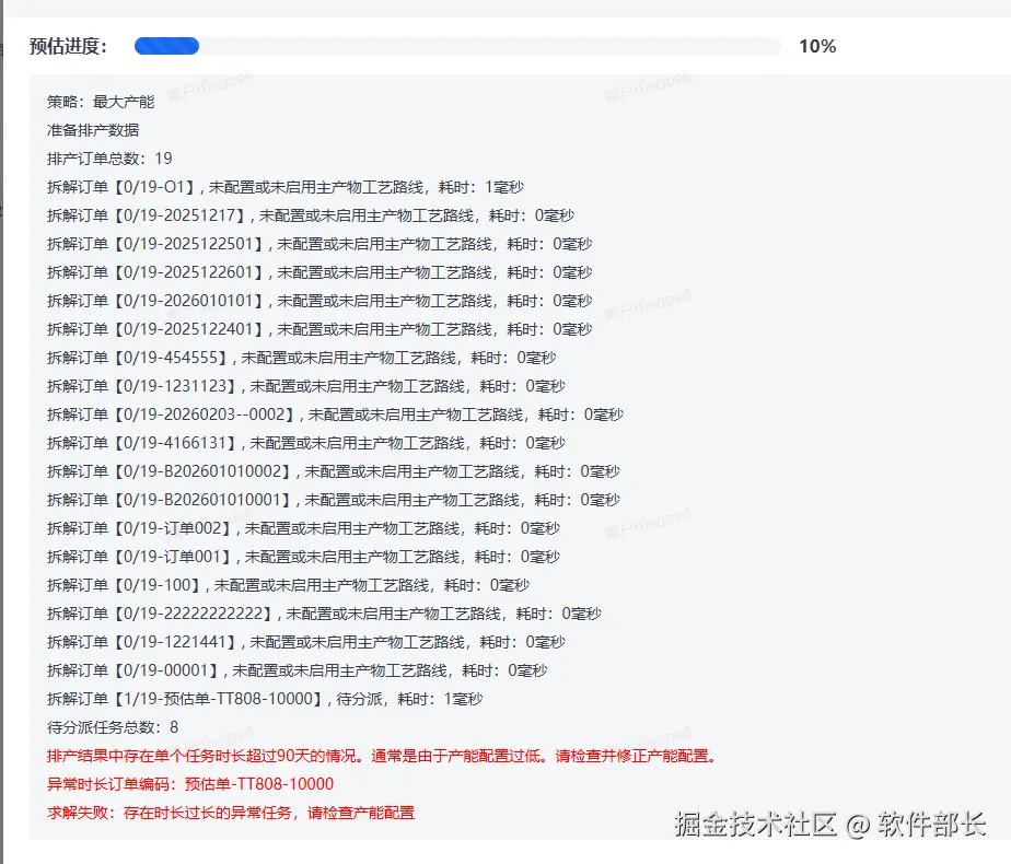 我们深知,一个因产能配置不当而产生的超长周期任务,会拖慢整个排产计算,更会导致甘特图渲染缓慢、操作卡顿。现在,系统会主动为任务时长和整体计划跨度设置“安全围栏”。一旦检测到异常,将立刻暂停并高亮提示具体问题订单与原因(如“产能配置过低”),指导您快速调整。这确保了每次排产计算高效、结果可靠,让您专注于计划本身,无需担忧系统性能。
