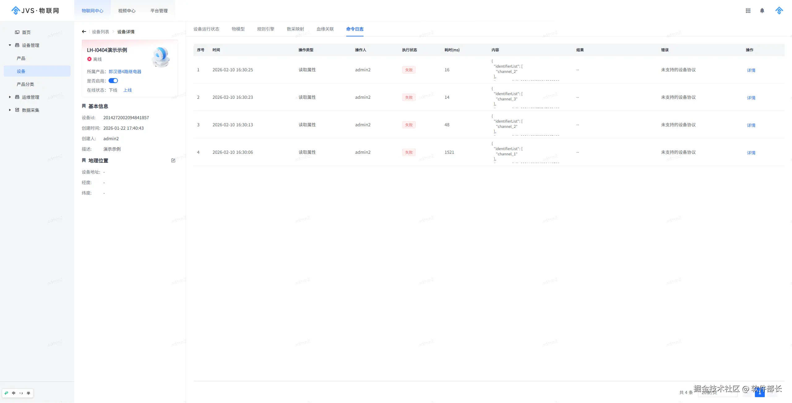 3、新增「设备命令日志」功能,让每一次设备交互都有迹可循。可以在设备详情页中,实时查看所有命令的下发状态、执行耗时与具体错误信息,实现操作全程可追溯,便于快速定界设备端或平台端问题。
