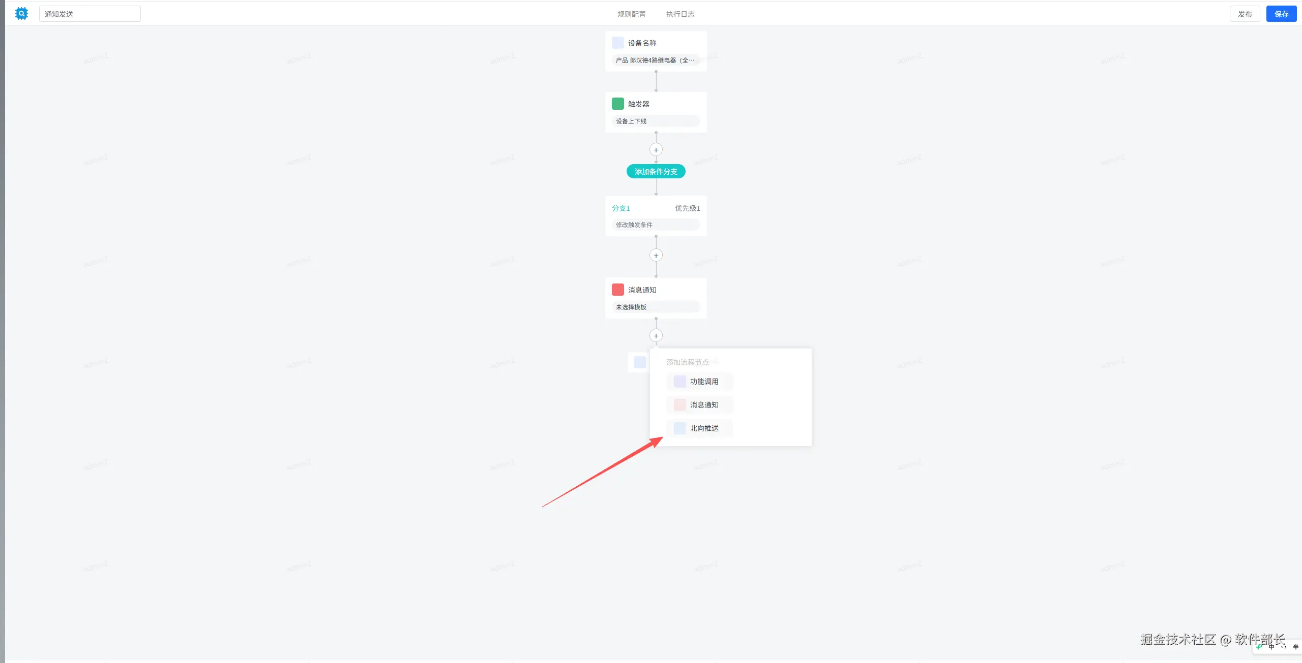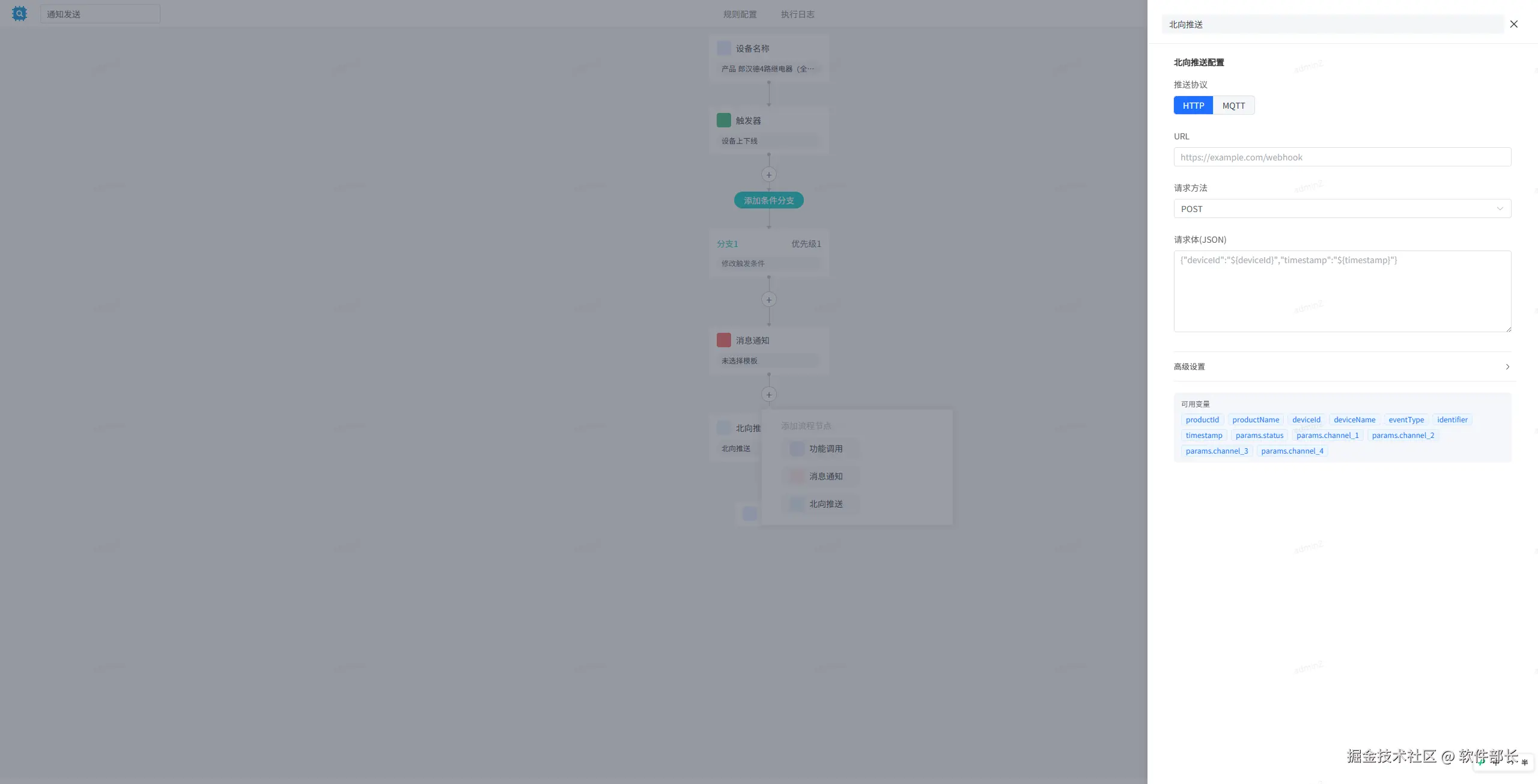 7、在规则配置的可视化流程中,新增 「北向推送」执行节点。可通过该节点,将设备事件或告警数据,以 HTTP/MQTT 协议实时推送至指定的外部系统 URL,并支持自定义请求方法与报文格式,轻松实现与第三方平台的数据集成。