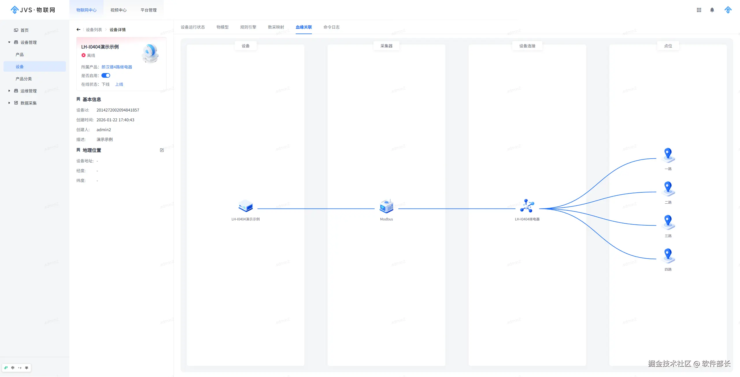 1、本次更新在「设备详情页」中新增了数采设备关系图。该功能通过可视化血缘拓扑,清晰展示当前设备与上层采集器、通讯协议及下属点位之间的完整连接关系与数据流向。双击图中任意节点图标,即可在右侧展开查看该节点的详细配置信息,实现全局拓扑与细节配置的无缝切换。