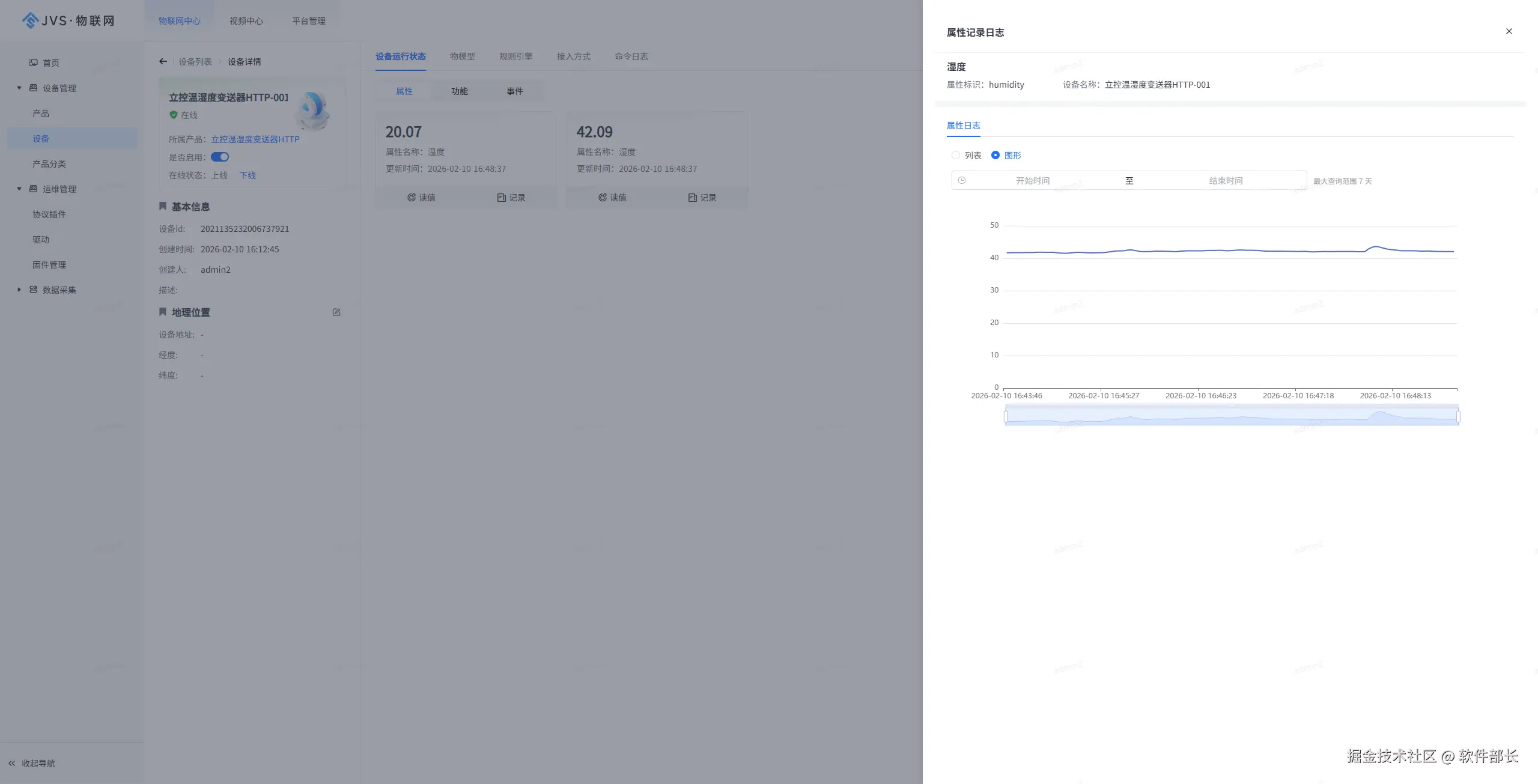 4、在设备详情页中,针对每个属性(如“温度”、“湿度”)新增独立的「属性日志」查询功能。可随时查看任一属性的历史数据,支持以列表或趋势图两种形式展示,并支持自定义查询时间范围(最大跨度7天),便于进行数据回溯与分析。
