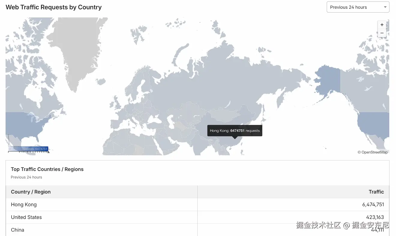 从 CloudWatch 看,流量确实回落了;我相信 Cloudflare 已经替我挡掉了很多垃圾流量。看起来其中一大块来自香港——我给那边开了 Cloudflare 的 JS Challenge 才能继续访问: