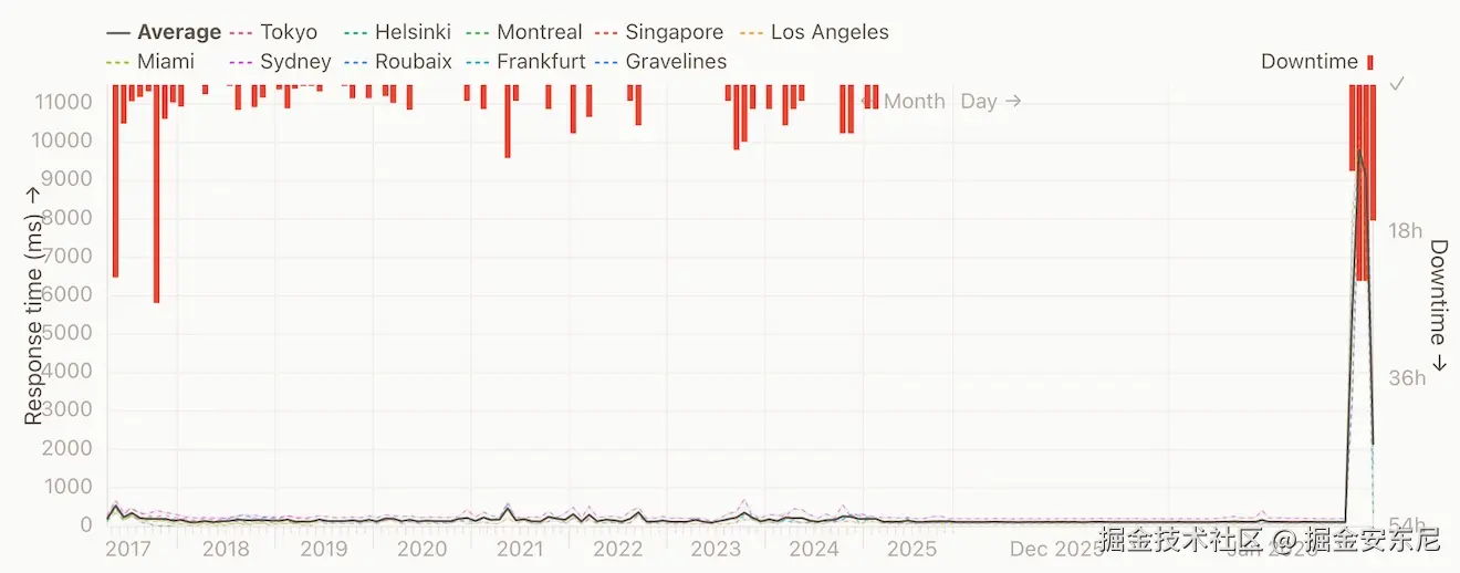 看过去 11 年的可用性曲线,宕机并不罕见,但这次完全不同(左边那次大故障先不算)。