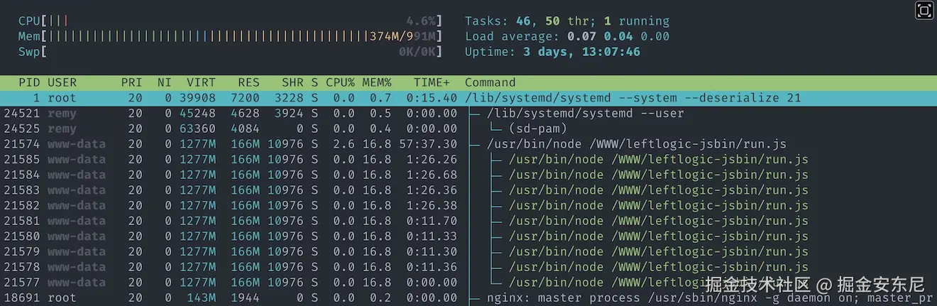 我能看到 CPU 长时间接近 100%,Node 的内存占用持续上涨(我用 htop)。