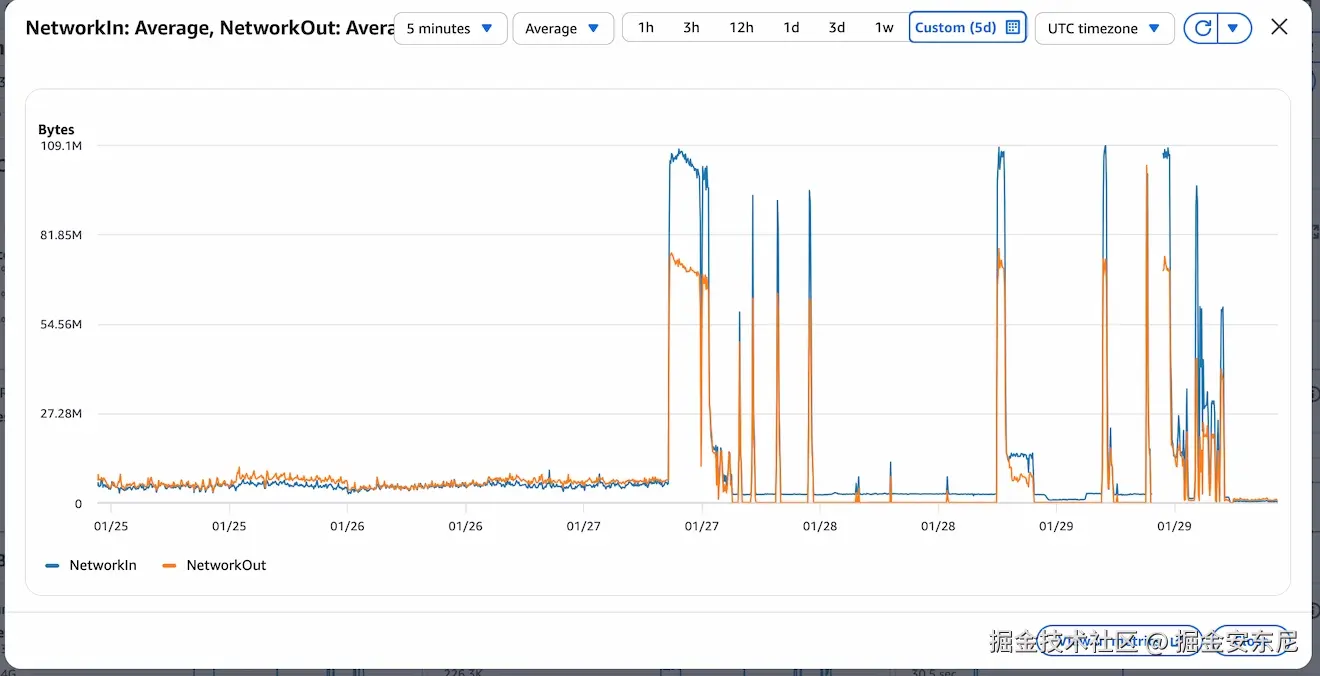 后来我看 CloudWatch,才知道入站流量把机器摁在地上摩擦:几天前还是正常水平,突然变成前所未有的网络入站峰值。图里 cliff edge 之后的那些下跌,是机器扛不住而失去响应。