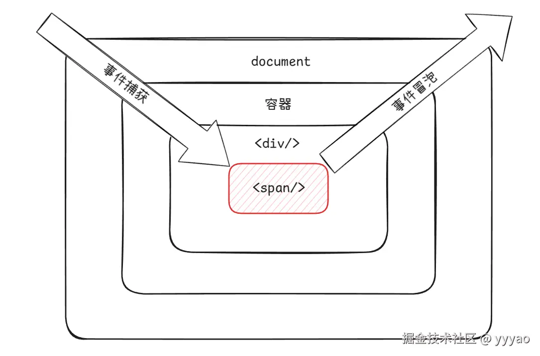 - 捕获阶段:从外到内,从最高层节点向下传播,执行监听处理函数,