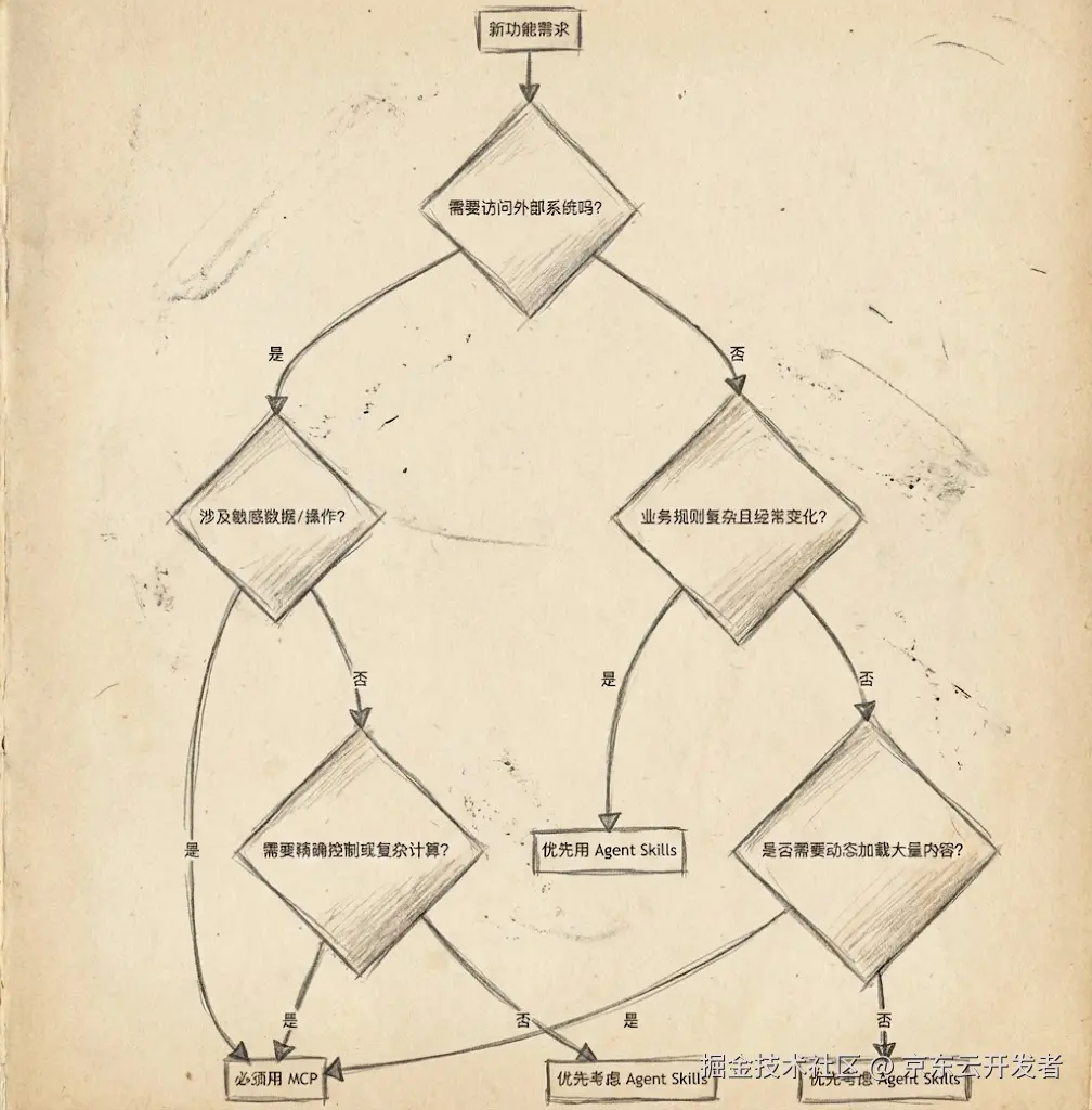 优先选择Agent Skills当: ✅ 业务规则复杂且经常变化:当决策逻辑依赖于业务策略而非技术实现时 ✅ 需要人类可读的规范:当非技术人员需要理解和修改行为规则时 ✅ 涉及主观判断:当任务需要权衡多个因素且没有明确的算法时 ✅ 强调一致性和合规性:当需要确保AI行为符合公司政策或法规要求时 ✅ 快速原型和迭代:当需要快速验证想法而不想投入大量工程资源时
